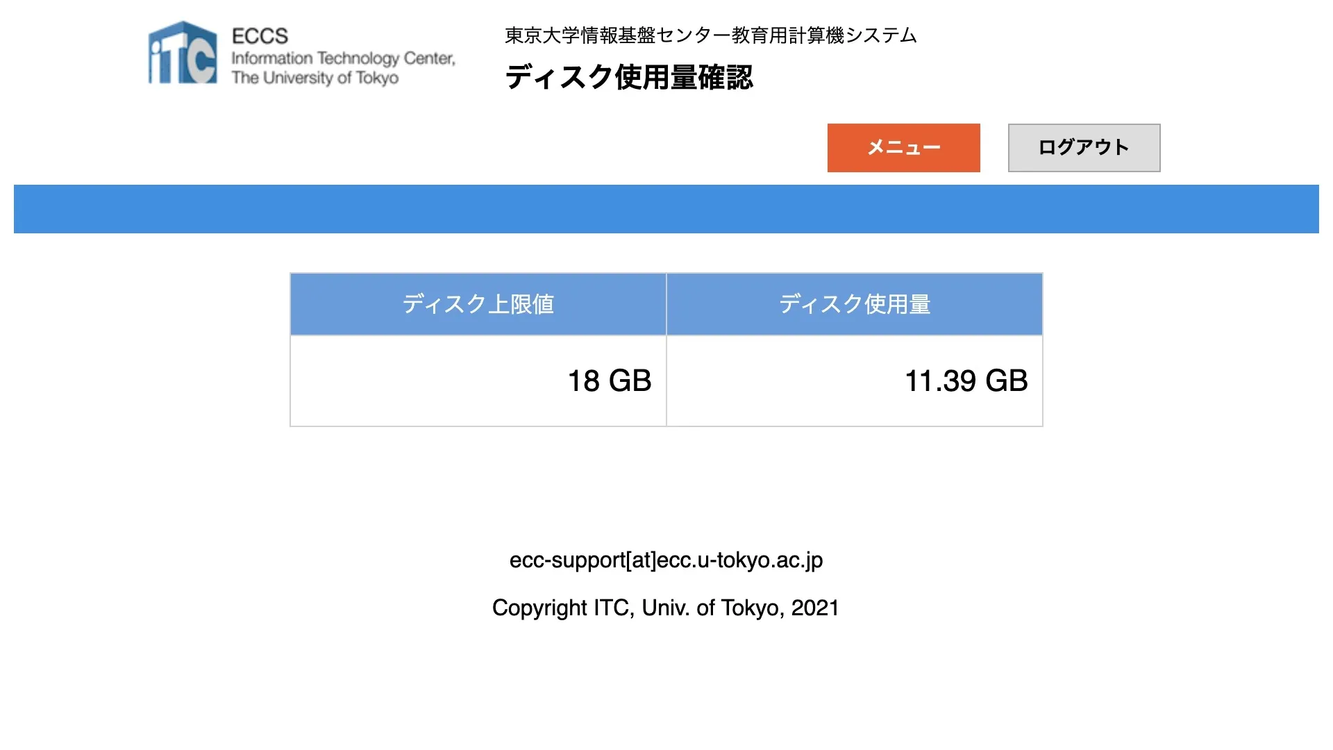現在どのくらいの容量を使用しているかは,ECCSポータルの「ディスク使用量確認」から確認できます.
