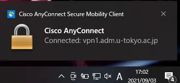 Step H: To view the current connection status, click on the “Cisco AnyConnect Secure Mobility Client” icon again. If the window displaying “Connected to vpn1.adm.u-tokyo.ac.jp” illustrated below appears, your device is connected to the UTokyo VPN.