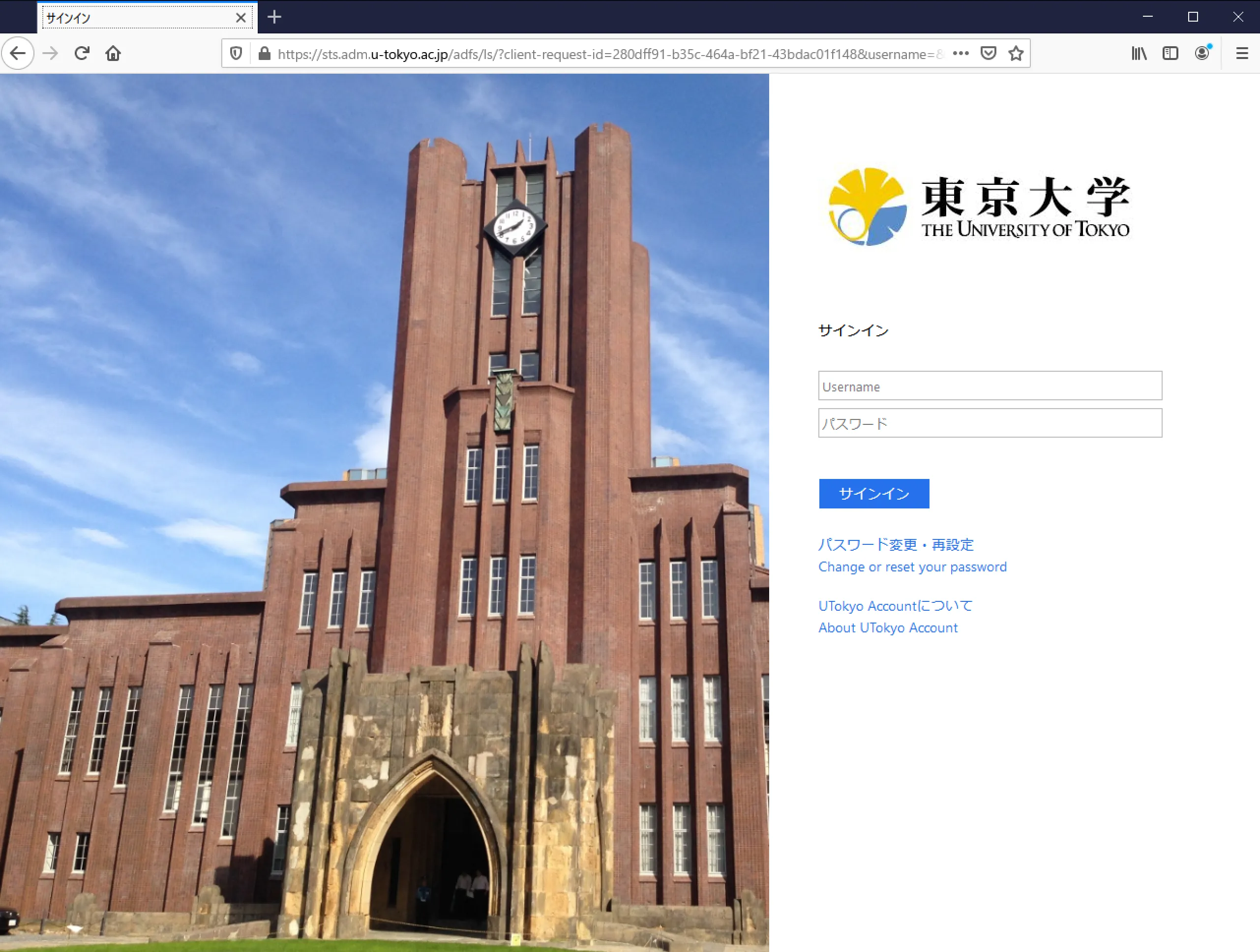 Step F: After clicking the “Connect” button, the following UTokyo Account authentication window appears. Log in with your UTokyo Account.