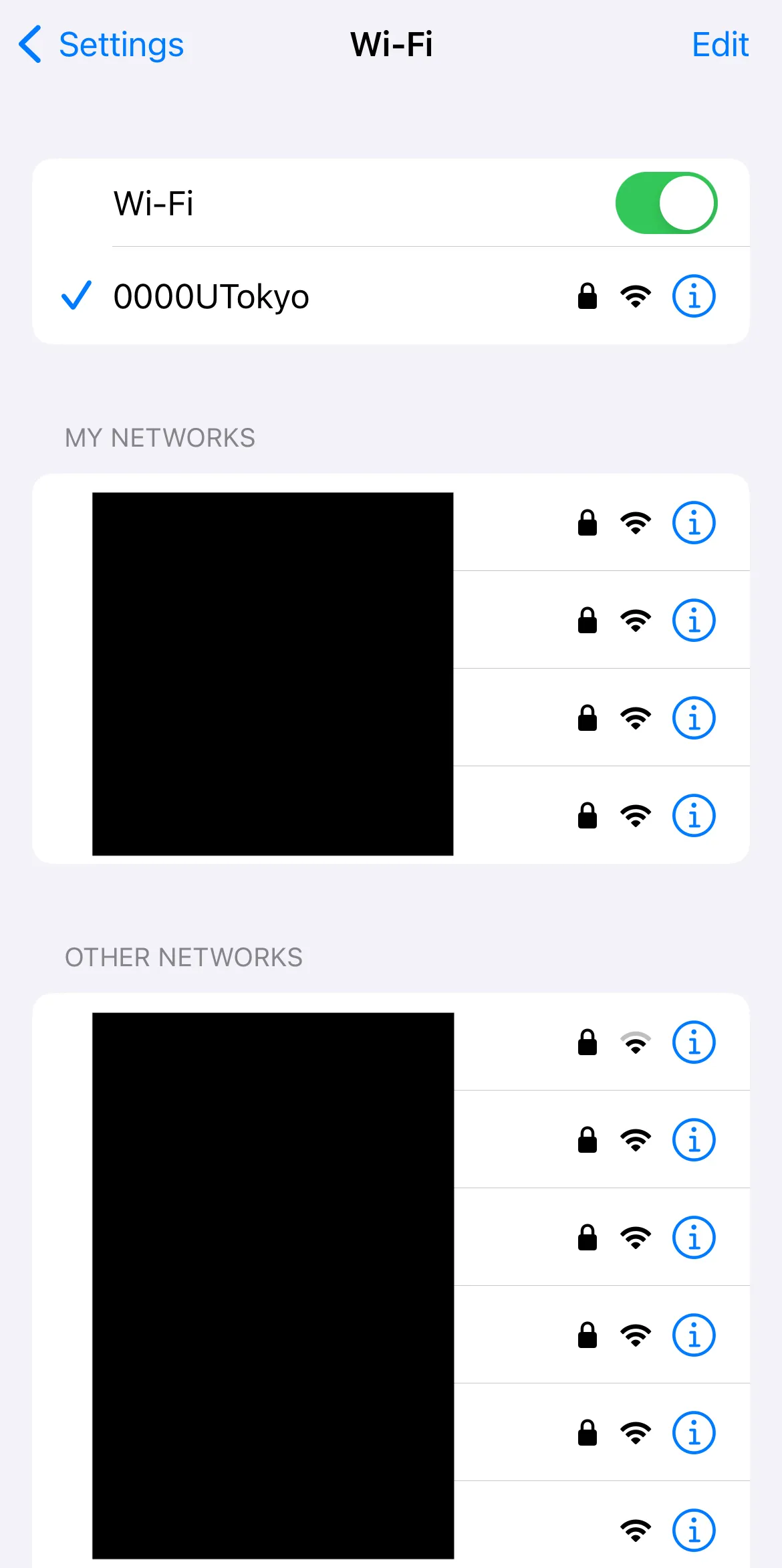 Tap the SSID found in Step 2, select “Forget this Network”. When the screen saying “Forget Wi-Fi network “0000UTokyo”?” comes up, select “Forget”.