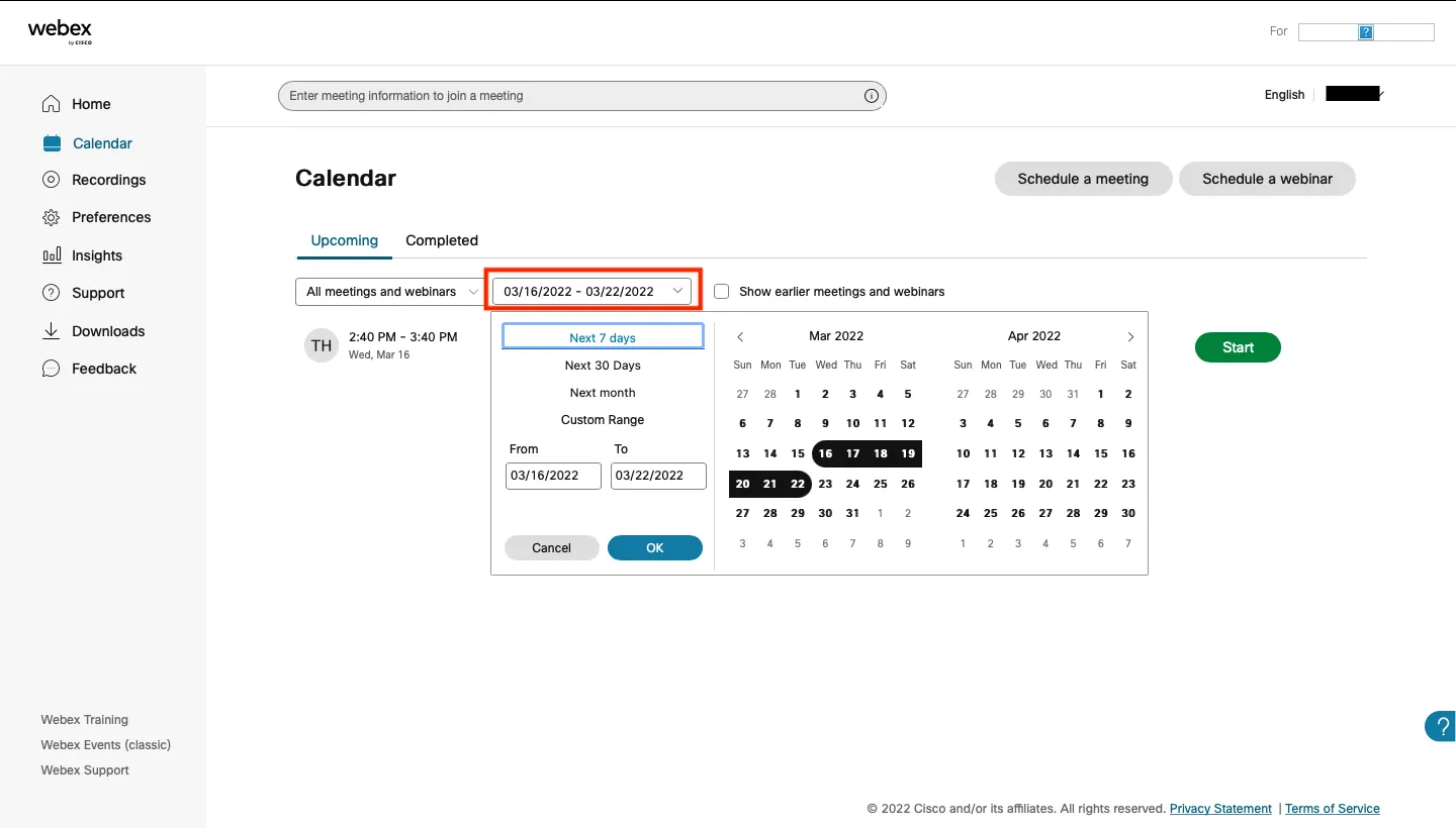 - Any meetings/webinars scheduled within a week will be shown on the home screen. If you wish to select a webinar scheduled more than a week away, you can search for it by clicking “Calendar” on the left of the home screen and entering the desired date.