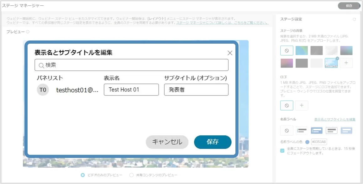 ※ステージに移動したパネリストに対してのみ表示名とサブタイトルを変更することができます.ステージにいないパネリストに対しては表示名のみ変更できます.