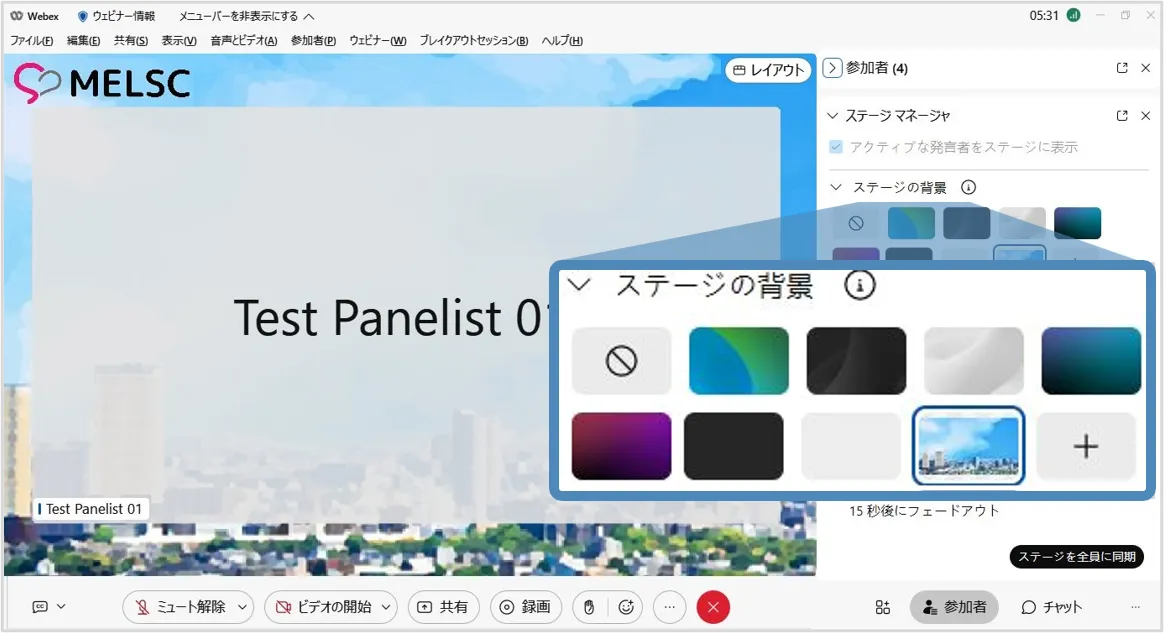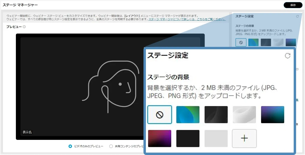 ステージマネージャー機能を使用すると,背景やロゴ・カスタマイズした名前ラベルをステージに設定でき,効果的なウェビナーの開催に貢献します.