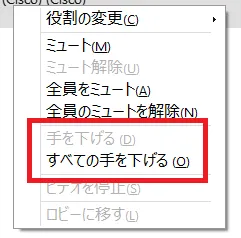 手を挙げている参加者を右クリックし,「手を下げる」「すべての手を下げる」を選択します.