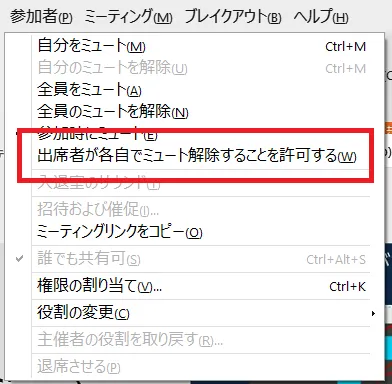 会議が開始されてからも,「参加者」メニューに「参加時にミュート」という機能があります.