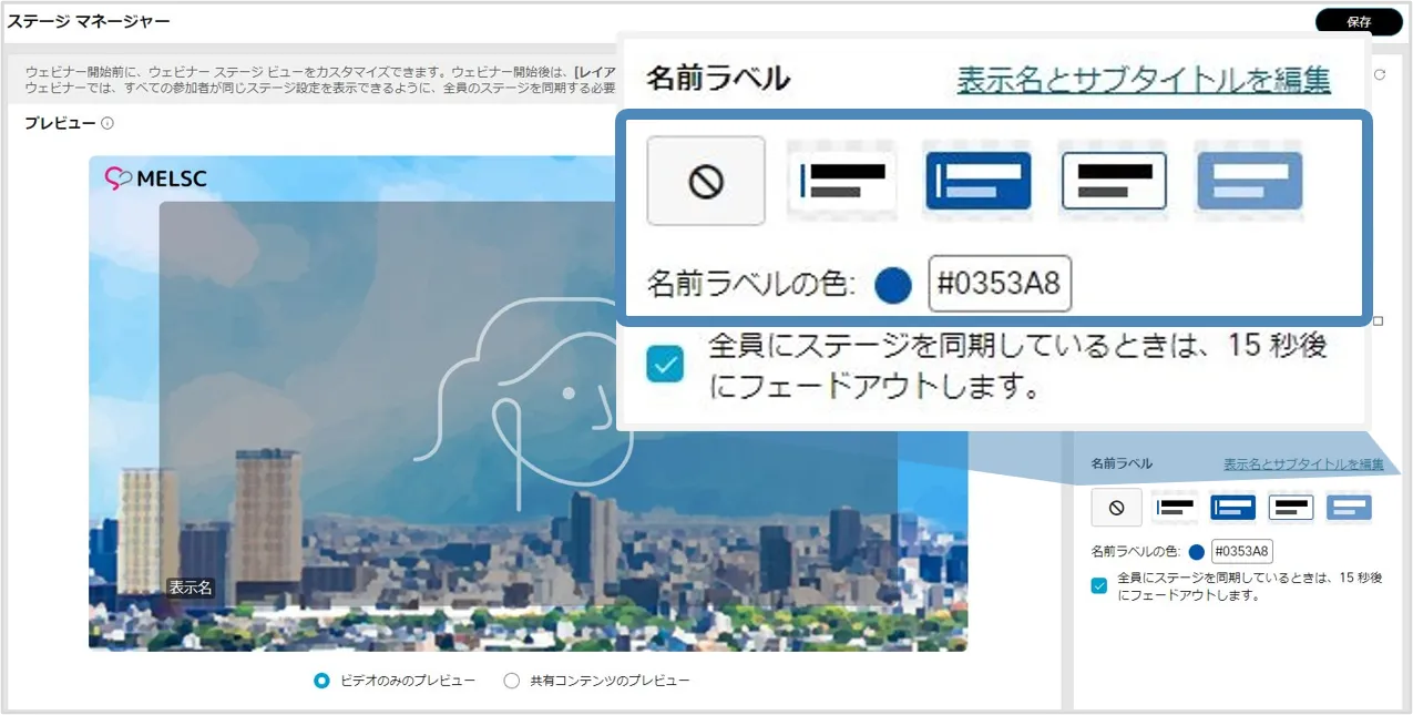 - 「全員にステージを同期しているときは,15秒後にフェードアウトします」を有効にすると,15秒後に名前ラベルは表示されなくなります.無効の場合,名前ラベルは表示しつづけます.