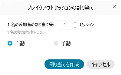 「ブレイクアウトセッション」ボタンを押すと,ブレイクアウトセッションの割り当てウィンドウが表示されます.