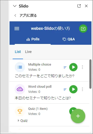 - Webex上で作成したSlidoイベントは,主催者のSlidoイベント一覧のページに保存されます.