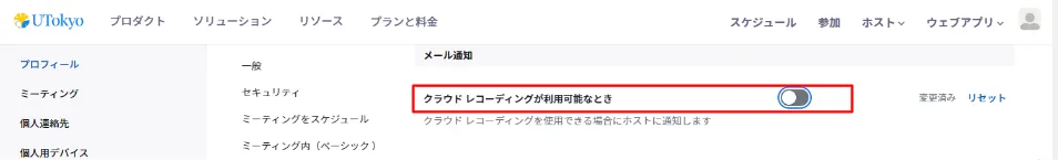 - メール通知をオフにしたい場合は,Zoomのウェブポータルの「設定」から,「設定」→「メール通知」の「クラウド レコーディングが利用可能なとき」という項目をオフにしてください.